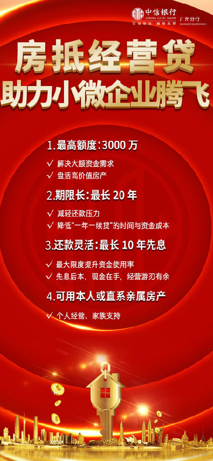 为响应国家“支持实体经济发展”的号召,中信银行广州分行大力发展个人房抵经营贷款特色产品,致力于降低小微企业融资成本,解决小微企业与民营企业融资难题,支持大众创业、万众创新。