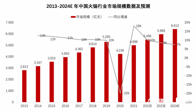 根据中国连锁经营协会此前发布的《2022年中国连锁餐饮行业报告》,2021年,火锅品类的竞争已经进入白热化阶段,预计行业增速在2021年达到高峰的18%之后,2022年-2024年,火锅市场规模增速将逐年下滑,分别约为10%、9%、7%。