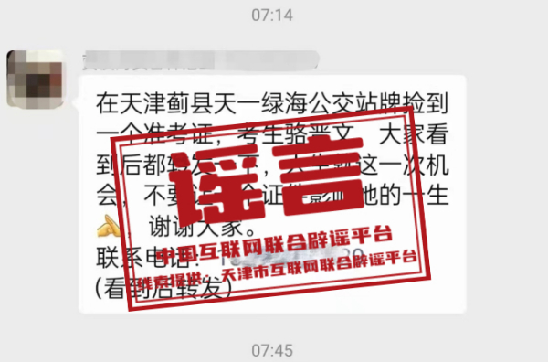 近年来,诸如“XX同学准考证丢失”“捡到XX同学准考证”这类谣言信息,每年都会在高考期间传播。除了名字、地点变换,谣言的套路别无二致。在此提醒,如果真的捡到准考证,应当及时同公安机关或考生所在考点学校联系,关于“准考证丢失”“捡到准考证”等谣言信息,勿轻易转发,更不要随意拨打此类信息留下的电话号码,以免上当受骗。(来源:“安徽警方”微信公众号、天津市互联网联合辟谣平台)