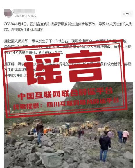 真相:网传“近日四川省宜宾市珙县罗渡乡发生山体滑坡事故,导致14人死亡和5人失踪”不实。对此,珙县人民政府新闻办发文称,珙县近日未发生山体滑坡事故。请广大网民不信谣、不传谣、不造谣,共同维护清朗网络空间。(来源:四川互联网联合辟谣平台、@珙县发布)