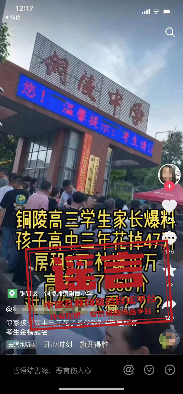 经核,“高中三年花费XX万 高考考了XXX分”类似的谣言版本在多地流传,而全国各地目前高考分数还未出炉,请大家注意甄别和防范。(来源:安徽网络辟谣平台、“铜陵公安在线”微信公众号)