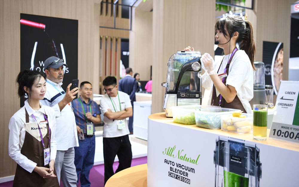 在第134届广交会上,进口展区的韩国企业展台介绍小家电产品(2023年10月15日摄)。新华社记者 邓华 摄