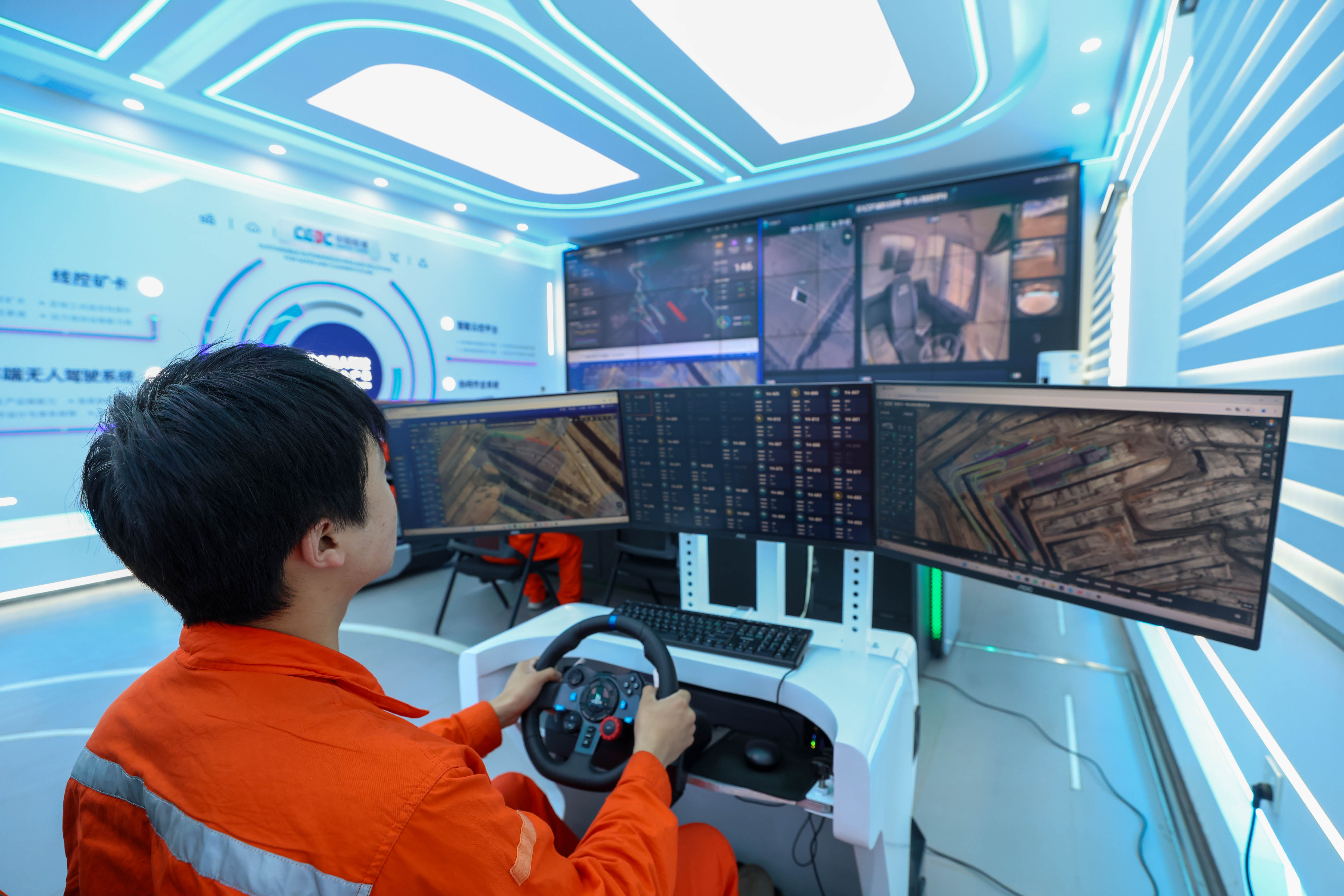 新疆准东宜化五彩湾一号露天煤矿的控制中心内,驾驶员在通过智能系统远程监控无人矿卡有效运行。张武军摄