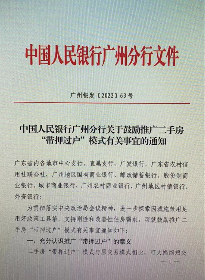 南都·湾财社记者向中国人民银行广州分行求证获悉,该份《中国人民银行广州分行关于鼓励推广二手房“带押过户”模式有关事宜的通知》(下简称《通知》属实。