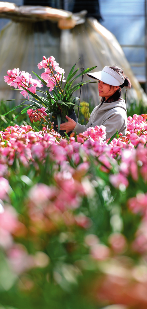 在昆明金才农业科技有限公司种 植基地,工作人员在查看大花蕙兰生 长情况(2024 年 11 月 25 日) 彭奕凯摄/本刊