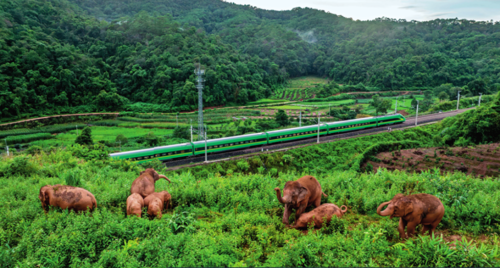 “然然家族”和“短鼻家族”象群在云南省西 双版纳傣族自治州景洪市大渡岗乡活动时,一列复 兴号列车从中老铁路上驶过(2024 年 8 月 8 日摄) 胡超摄/本刊