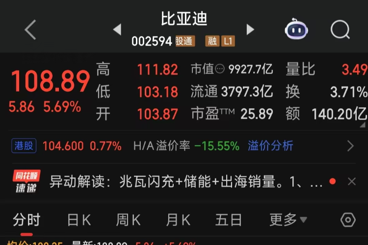 油价飙涨利好,比亚迪A股一度涨超8%,总市值重回万亿