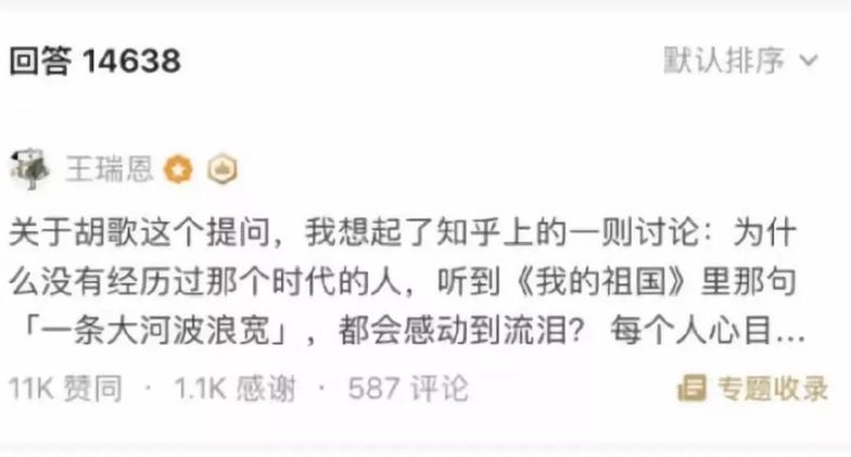 得到最高“赞同”的网友“王瑞恩”回答说:很多人也许会有疑问,为什么没有经历过战争时代的人,听到《我的祖国》里那句“一条大河波浪宽”,都会感动到流泪?