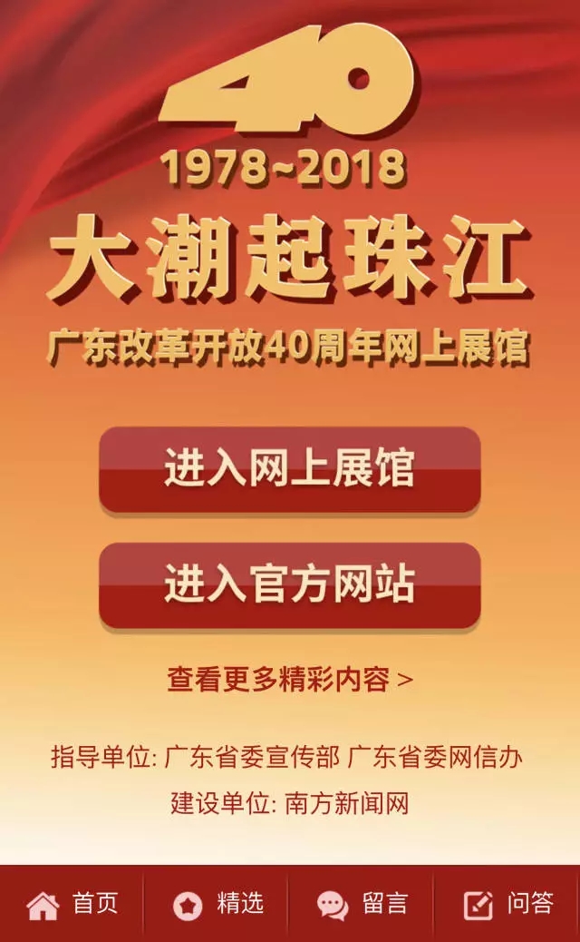 该展馆还设置了多种互动形式,网友既可以参加有奖知识问答,还可以在线留言,给广东改革开放点赞和鼓劲。同时,为适应移动互联网传播,网上展馆支持手机客户端、Pad端和VR载具浏览体验,网友可以从更多视角了解展览全貌。展馆中的大量精彩内容都设置了二维码,支持一键分享到朋友圈。