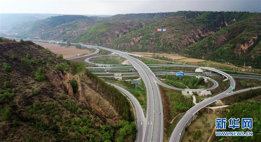 陕西延安洛川县境内的包茂高速公路盘道(5月5日无人机拍摄)。新华社记者 刘潇 摄