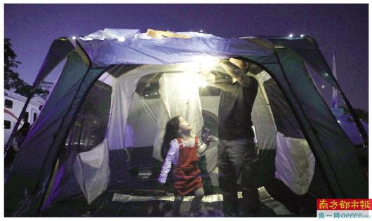 2019年11月9日,深圳宝安海上田园景区举行第四届深圳宝安帐篷节。夜幕降临,一名父亲为帐篷挂上灯饰。