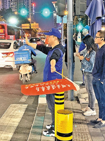 下班后,“蓝马甲”走上街头,协助维持交通秩序。 (区义工联供图)