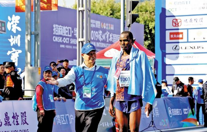 2019深圳宝安国际马拉松赛终点,义工带领完赛选手到休息区域。