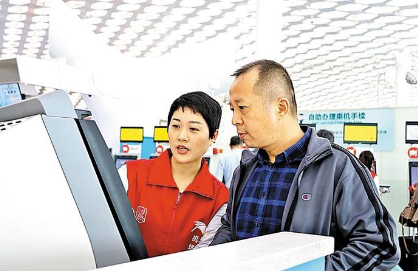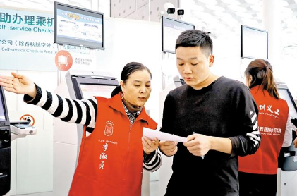 宝安国际机场,义工引导旅客自助办理登机牌。