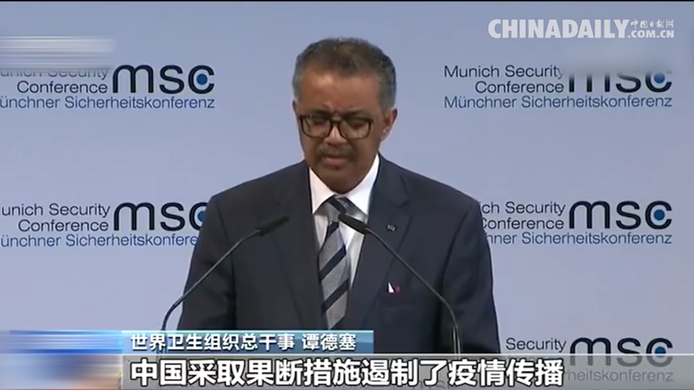 在德国慕尼黑安全会议上,世界卫生组织总干事谭德塞赞赏中国在抗击新冠肺炎疫情中所作出的一系列的努力。