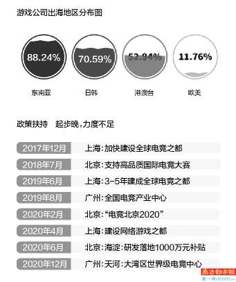 近年来,北京、上海、深圳、成都、杭州对游戏产业的扶持力度明显加大,且已经深入到区级层面。比如,2017年,上海发布“文创50条”,从电竞场馆建设等硬件到创新、人才、资金等产业化要素资源出台了一系列政策进行扶持。广州目前尚无针对游戏产业的整体发展规划。