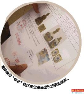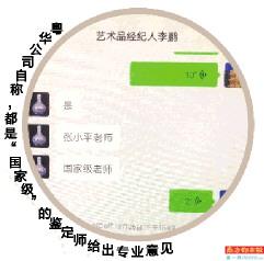 事主将藏品带到公司后,第三步就由鉴定“专家”来完成。这些专家根本不具备古董文物的鉴别能力,他们只负责给出“专业”意见,告诉事主他的藏品“独一无二”,具有超高价值,以此提出让事主缴纳几百到几千元不等的鉴定费用,以及几千元不等的鉴定证书出具及制作费用。