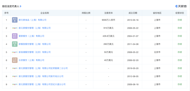 天眼查信息显示,上述5家企业的法定代表人均为张永贵,其中新元素餐饮管理(上海)有限公司为新食潮餐饮管理(北京)有限公司的控股股东。