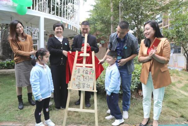 最后,在嘉宾代表朱慧春副科长,罗锡庆副科长、许楷楠会长和园方代表颜丽园长、家委代表林艳女士以及幼儿代表林令仪小朋友、黄伟杰小朋友的共同揭牌下,“幸福花园观景台”宣布正式开园啦!