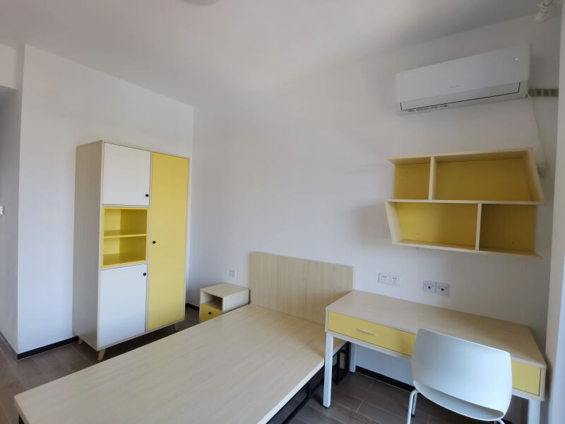 打开门,可以看见单间宿舍以白色墙体涂料搭载木纹砖为基础,整体室内装修风格简约大方,设计以实用性为主,床位、衣柜、书架、办公桌布局合理,整体宿舍利用率高。