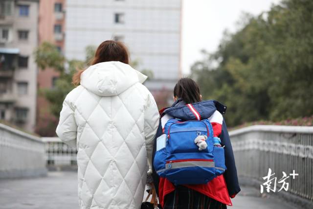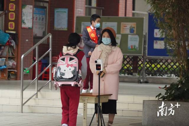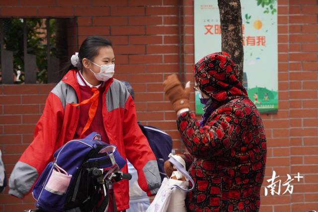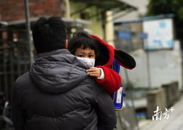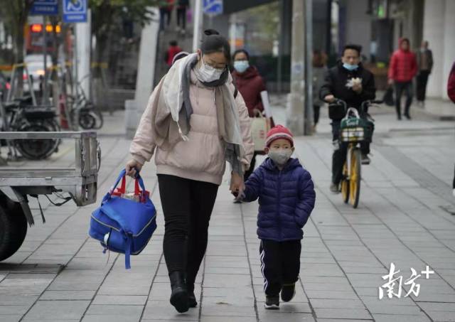 27日7时30分左右,杨箕小学附近,寒风中家长送孩子们上学。