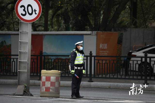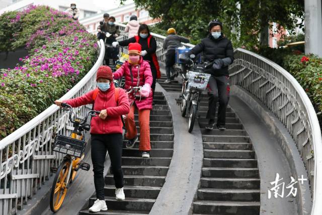 27日上午,广州市越秀区盘福立交上,市民穿上厚厚的大衣,顶着寒风上班上学。