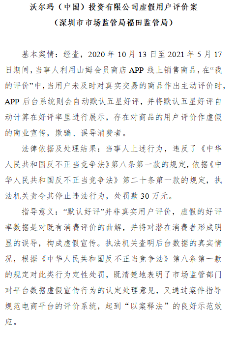 南都记者留意到,其中包括了沃尔玛(中国)投资有限公司虚假用户评价案。据介绍,山姆会员商店APP线上销售商品在“我的评价”中,当用户未及时对真实交易的商品作出主动评价时,APP后台系统则会自动默认五星好评,并将默认五星好评自动计算在好评率里进行展示,存在对商品的用户评价作虚假的商业宣传,欺骗、误导消费者。违反了《中华人民共和国反不正当竞争法》第八条第一款的规定,依据《中华人民共和国反不正当竞争法》第二十条第一款的规定,执法机关责令其停止违法行为,处罚款30万元。