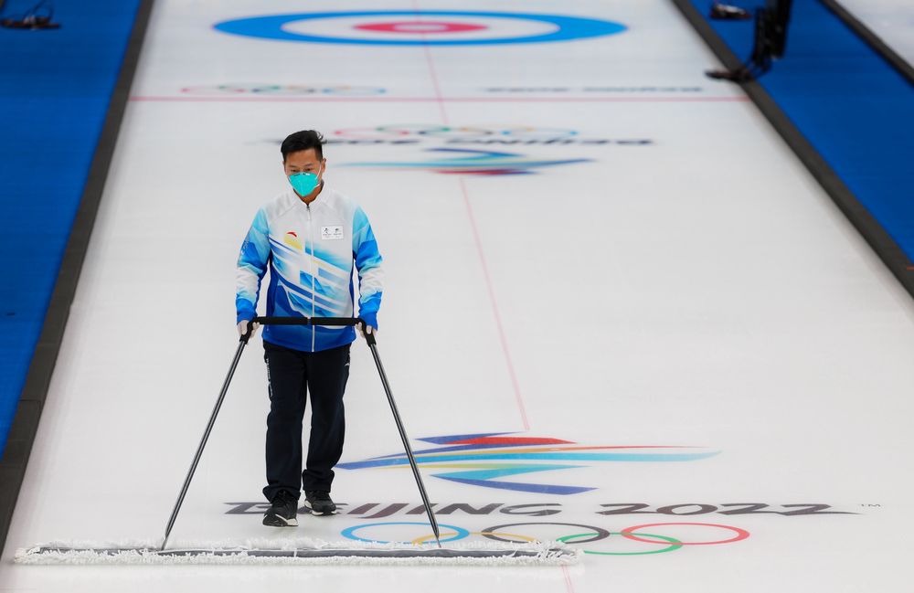 1月26日,一名工作人员在北京冬奥会冰壶比赛场馆国家游泳中心“冰立方”进行准备工作。新华社记者 刘续 摄