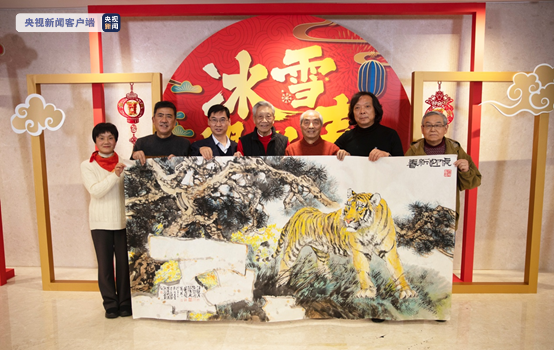 6位艺术家围绕虎年新春和北京冬奥会在现场共同创作了一幅大型画作《虎迎新春》,以迎接虎年新春和北京冬奥会的到来。