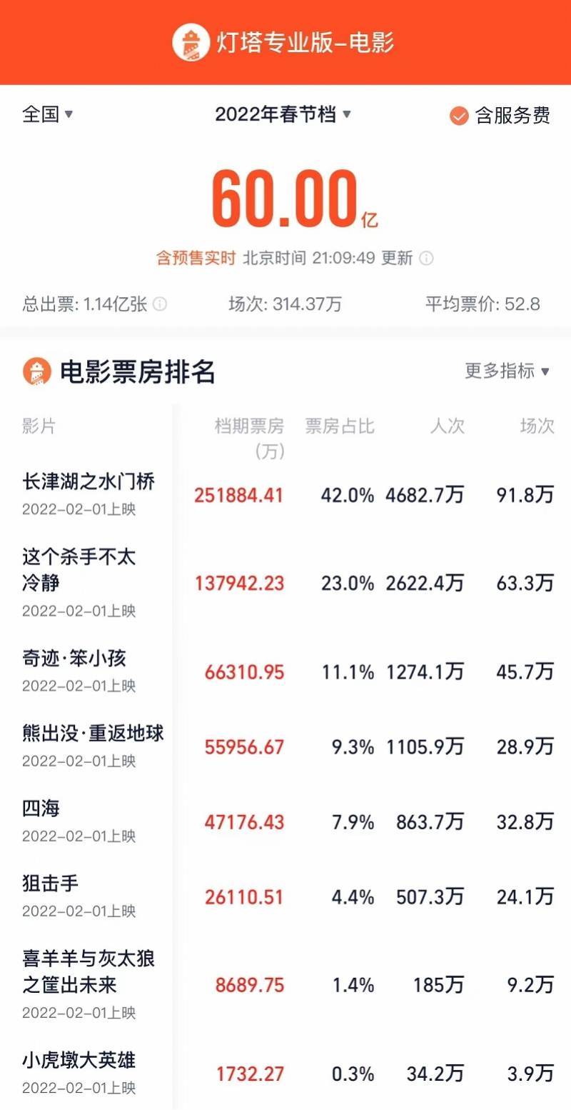 据灯塔专业版,截至2月6日21时9分,2022春节档(1.31-2.6)总票房(含当天预售)正式突破60亿,超过2019春节档总票房59.05亿元,位列中国影史春节档总票房第二。
