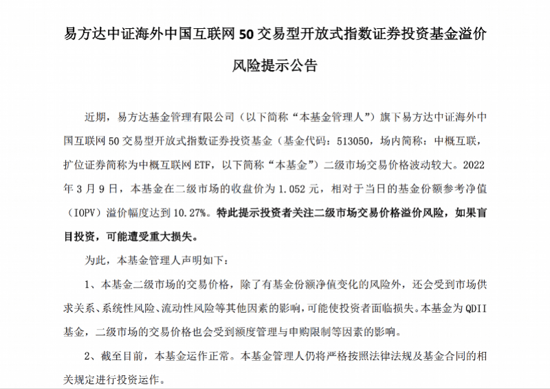 3月10日凌晨,中概互联网ETF基金公告提示溢价风险。公告称,近期,中概互联网ETF二级市场交易价格波动较大。3月9日,该基金在二级市场的收盘价为1.052元,相对于当日的基金份额参考净值(IOPV)溢价幅度达到10.27%。基金管理人易方达基金公司提示投资者关注二级市场交易价格溢价风险,如果盲目投资,可能遭受重大损失。