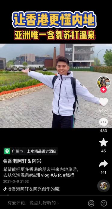 他们团队制作的短视频作品“让香港更懂内地——亚洲唯一含氡苏打温泉”,吸引了超过8400人次的点赞,播放量超过14.5万,并登上了抖音相关话题榜单第二。