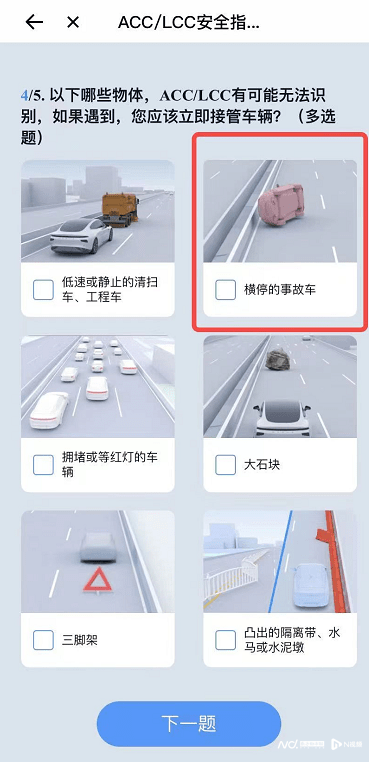小鹏汽车工作人员向南都记者出示的截图显示,在驾驶辅助功能开启前的“智驾分”考试中有一道题目契合车主邓先生描述的情况。题目显示,当道路前方出现横停事故车时,ACC/LCC可能无法识别。