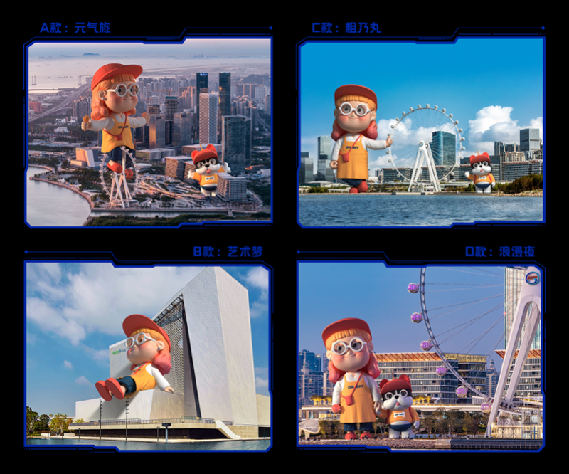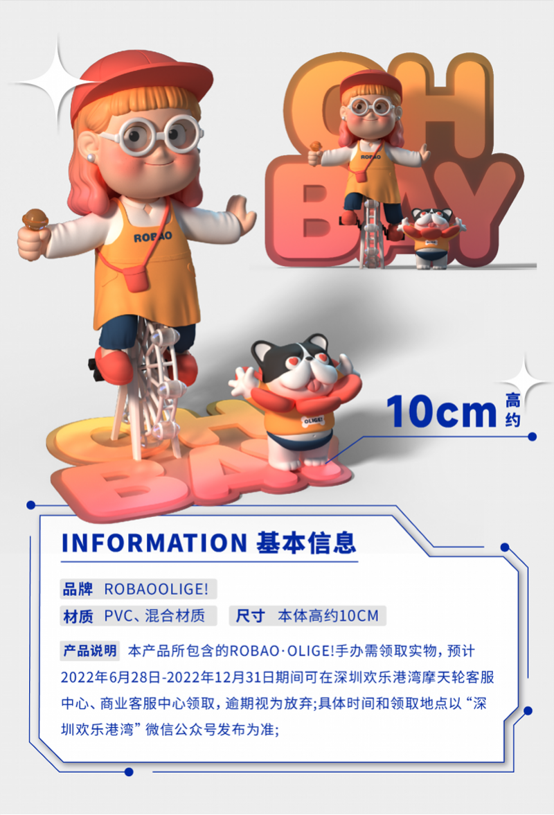 欢乐港湾联合中国新一代的中国新锐玩具设计师、DREAMROOM品牌主理人刘梦,创作4款数字艺术藏品《“摩”力港湾》,分别为元气旅、艺术梦、粗乃丸、浪漫夜,描绘元气女孩ROBAO与宠物OLIGE在欢乐港湾的美好生活。ROBAO寓意“福包”希望福运一直包裹着你,以标志性的笑脸,内心充满温暖和希望的小女孩传递积极温暖的能量。宠物OLIGE寓意“加油”!希望可以给你打气!每一天笑口常开,享受小确幸!