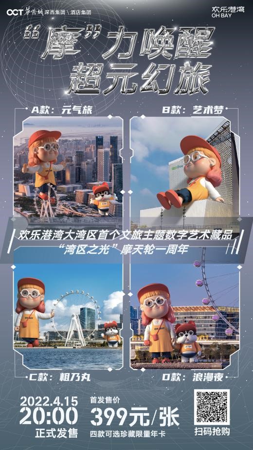2021年作为虚拟世界“元宇宙”的元年,元宇宙一触即发。深圳欢乐港湾在“湾区之光”摩天轮一周年之际,打破常规、拥抱数字,由腾讯文旅及腾讯至信链提供底层技术及合规发行支持,携手中国新锐玩具设计师、DREAMROOM品牌主理人刘梦,推出大湾区首个文旅主题数字艺术藏品——“湾区之光”摩天轮一周年珍藏限量年卡,数字艺术藏品《“摩”力港湾》共有4款,每款限量1999份。于2022年4月15日正式发布,用户可通过欢乐港湾官方微信公众号“深圳欢乐港湾”购买售价为399元的“湾区之光”摩天轮一周年珍藏限量年卡(可在激活后一年内免费乘坐摩天轮),用户购买后进入官方小程序“城市V度假”,即可获赠《“摩”力港湾》数字艺术藏品和联名款限量潮玩手办。