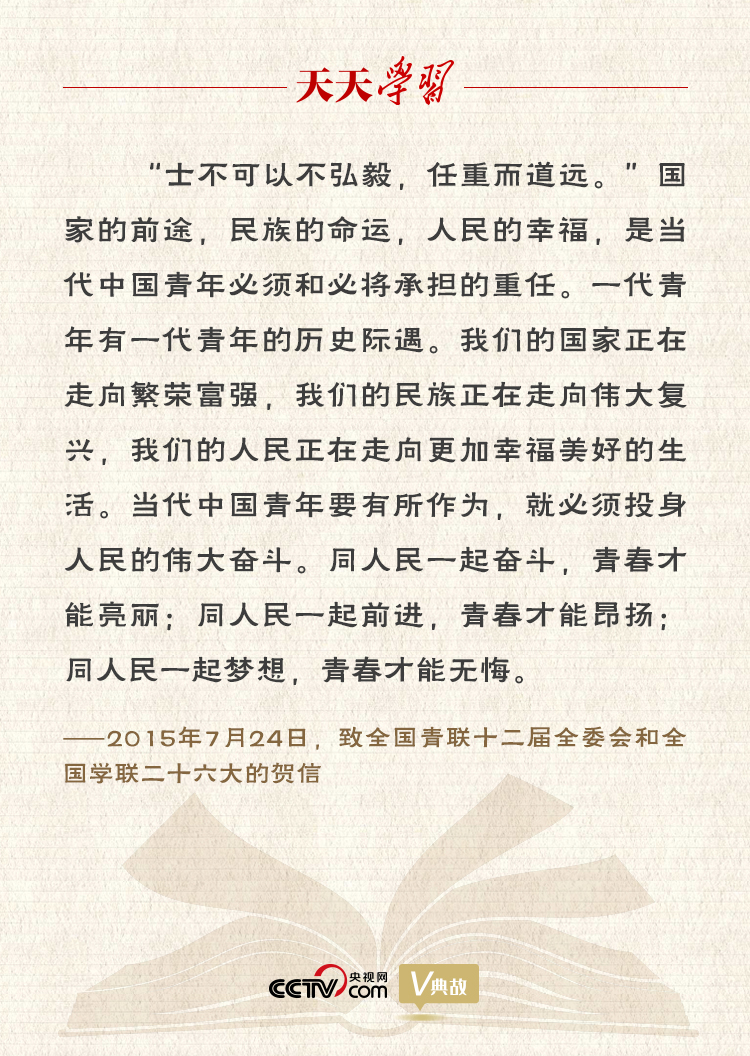 一个有远见的民族,总是把关注的目光投向青年;一个有远见的政党,总是把青年看作推动历史发展和社会前进的重要力量。我们党自成立之日起,就始终把青年看作是祖国的未来、民族的希望,始终高度重视青年工作,这是党永葆青春活力的重要源泉。在党的领导下,一代又一代中国青年满怀对祖国和人民的赤子之心,积极投身党领导的革命、建设、改革开放和现代化建设的伟大事业,为人民战斗、为祖国献身、为幸福生活奋斗,把最美好的青春献给祖国和人民,谱写了一曲又一曲壮丽的青春之歌。