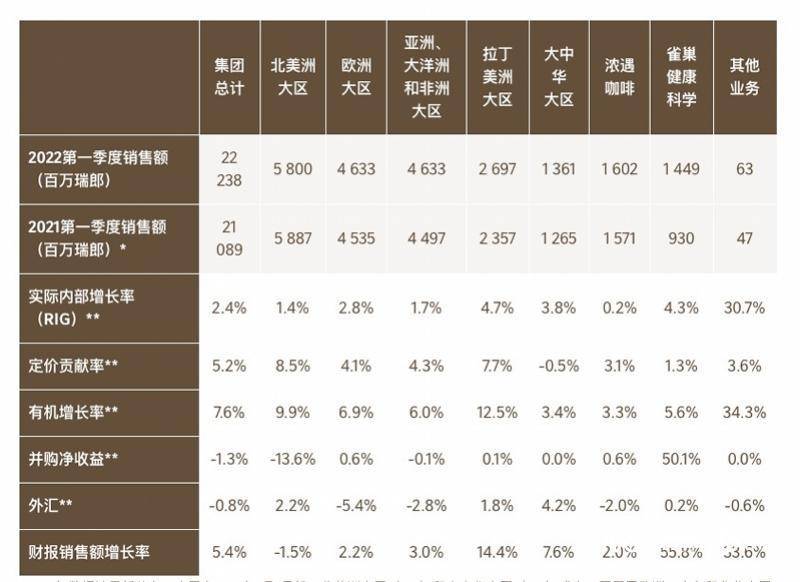据南都湾财社记者了解,在雀巢的财务报表中,浓郁咖啡作为独立业务板块进行核算。根据雀巢2022年一季报数据,浓遇咖啡在全球范围内为雀巢带来了16.02亿瑞士法郎(折合人民币108亿元)销售收入,相比去年同期(15.71亿元瑞士法郎)增加了约1.9%。