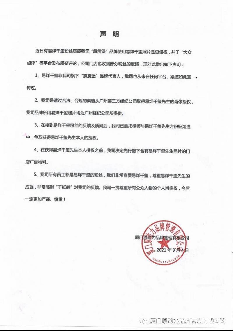 2021年9月,“霹雳堡”发表公告称,易烊千玺并非霹雳堡代言人,使用的照片都是经过广州第三方经纪公司的授权。