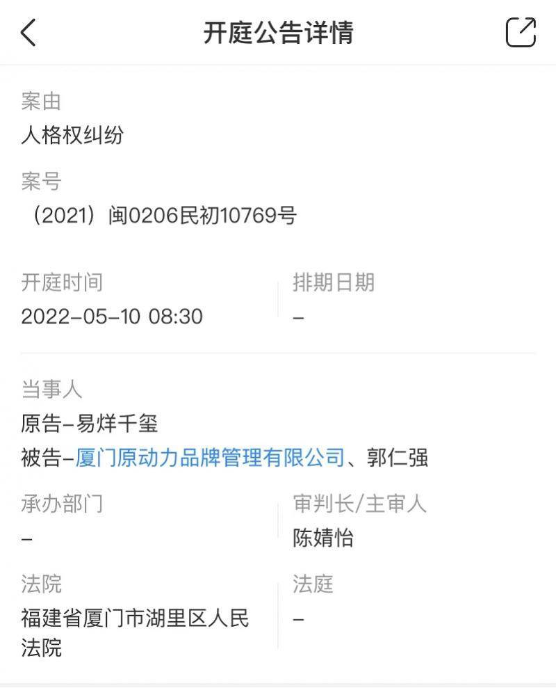 南都湾财社记者5月9日从天眼查获悉,易烊千玺起诉厦门原动力品牌管理有限公司、郭某的人格权纠纷一案,将于5月10日厦门湖里区人民法院开庭。