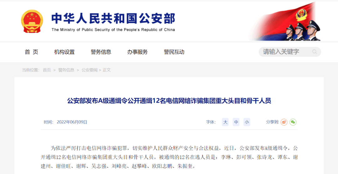 6月9日,南都记者从公安部获悉,近日,公安部发布A级通缉令,公开通缉12名电信网络诈骗集团重大头目和骨干人员。