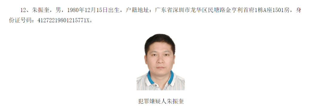 南都记者注意到,被通缉的第12名在逃人员朱振奎,出生于1980年12月15日,户籍地址在广东省深圳市龙华区民塘路金亨利首府1栋A座1501房。