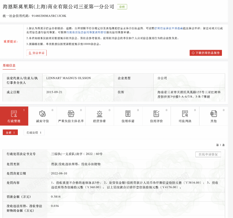 根据“信用中国”资料显示,海恩斯莫里斯(上海)商业有限公司三亚第一分公司销售以不合格产品冒充合格产品的连体泳衣,被三亚市综合行政执法局依据《产品质量法》第五十条的规定,罚款3816元,没收违法所得360元。
