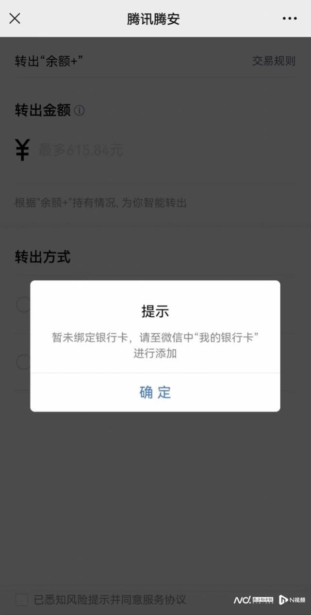 据苏先生提供的截图显示,其在进行余额转出操作时,页面会弹出让其绑定银行卡的提示。苏先生称,如果不更新相关信息就没办法在理财通进行操作,但银行卡上的名字用的是繁体名字,与理财通上的简体名字不同,所以无法绑定银行卡更新信息。