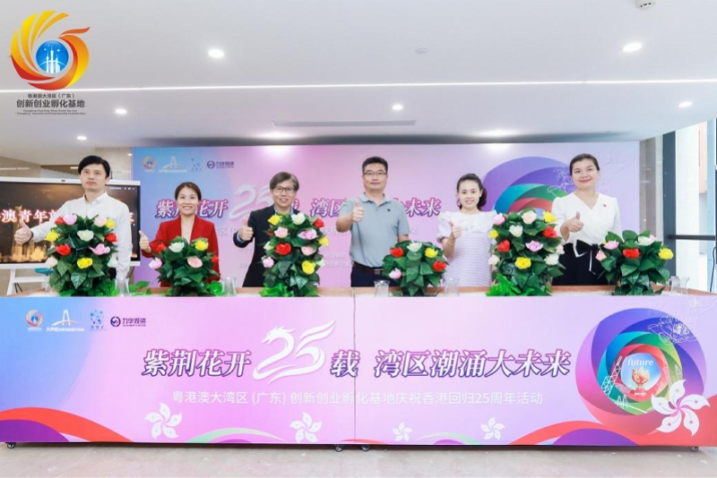 2022年7月1日下午,粤港澳大湾区(广东)创新创业孵化基地(以下简称“创新创业孵化基地”)“紫荆花开25载,湾区潮涌大未来”隆重庆祝香港回归祖国二十五周年活动暨港澳青年就业创业之家平台成立顺利举行,40多位来自大湾区的港澳青年代表在现场参与本次活动。