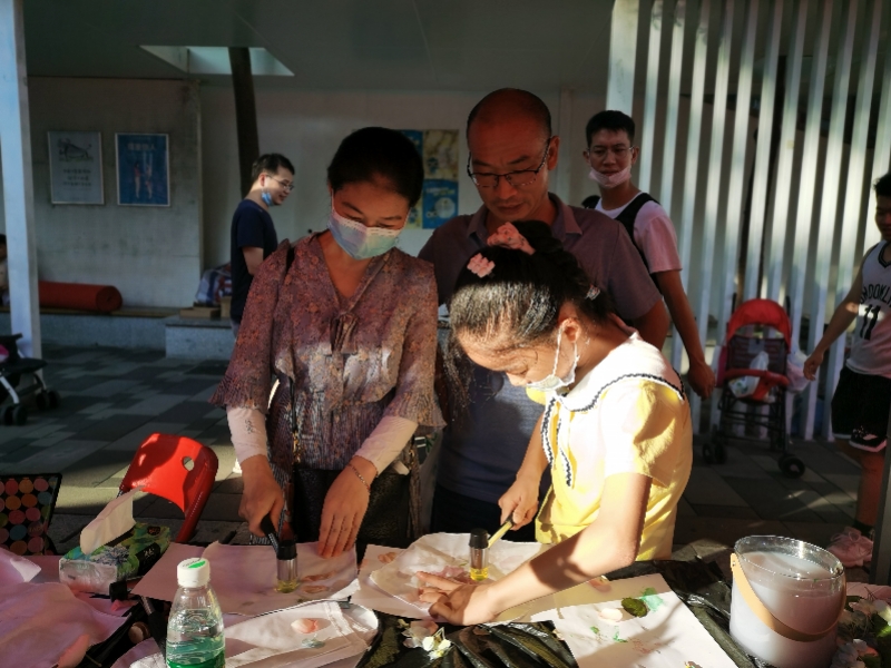 在手工制作区,设置了叶脉染色、植物拓染、编织袋制作等摊位,现场的居民可以自行选择进行DIY制作,他们运用小铁锤在素色的手绢上拓印出了玫瑰、满天星等图案,为居民提供了展示自我、动手制作的平台。
