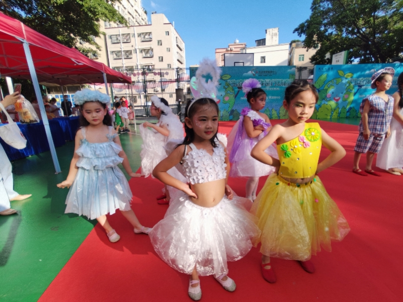 在表演区,本社区20名儿童登台走秀,展示用塑料袋、编织袋、珍珠棉等环保元素制作而成的服装,向居民展示了变废为宝的新颖创意,充分体现了环保的理念。