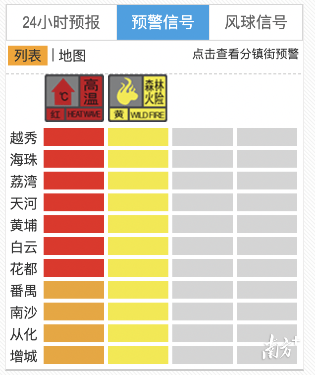 目前越秀、天河、海珠、荔湾、黄埔、白云、花都共7个区高温红色预警信号生效,其他区高温橙色和全市森林火险黄色预警信号正在生效中,广州市气象灾害(高温)Ⅲ级应急响应正在生效中。