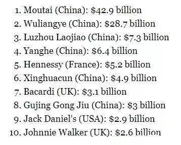 “50大烈酒品牌”(Spirits 50)总价值1426亿美元,中国10个品牌上榜,价值976亿美元,占比68.4%。茅台、五粮液、泸州老窖、洋河包揽前四名。