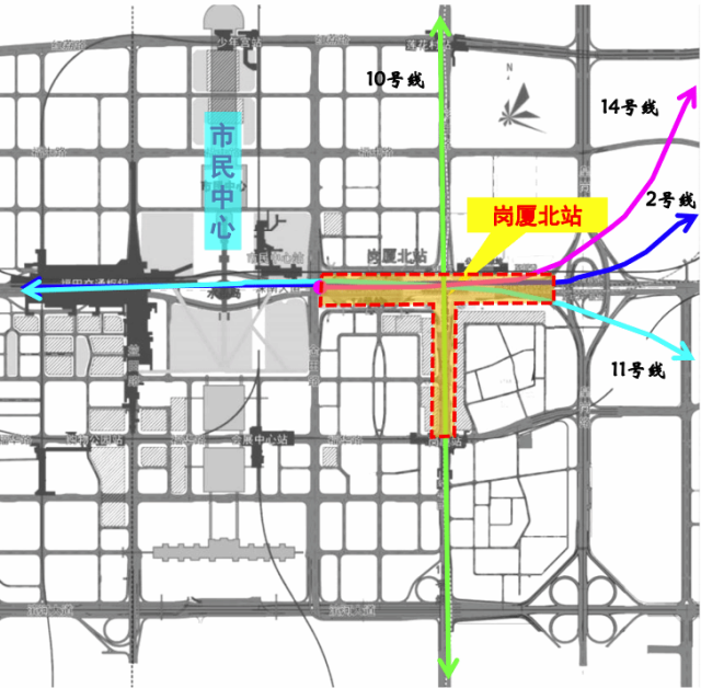# 地铁11号线二期(在建)从福田站向东延伸,其中东延第一站就是岗厦北站,预计2025年建成通车。
