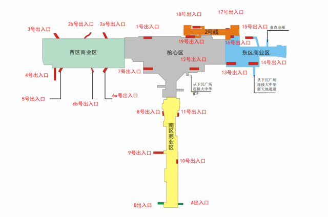 其地下空间以10号线、11号线二期(在建)、14号线(在建)与2号线地铁换乘,集散及市政过街功能为主,兼顾商业,总共地下三层结构,总建筑面积约22.49万㎡。